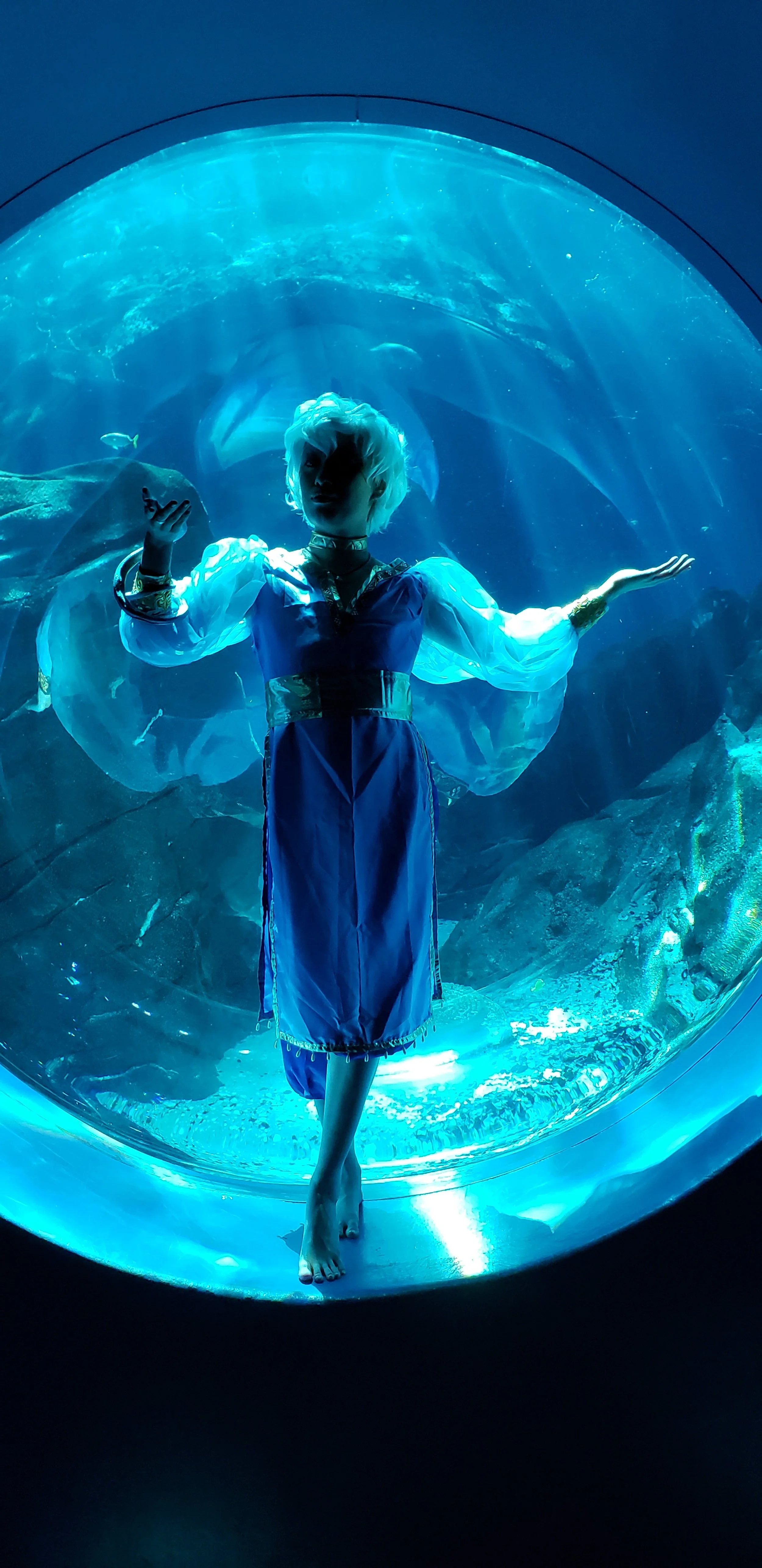 This cosplay was made in 2020. it has Embroidered details, hand sewn pearls on the trim and organza sleeves. Photos were taken at the Atlanta Aquarium.